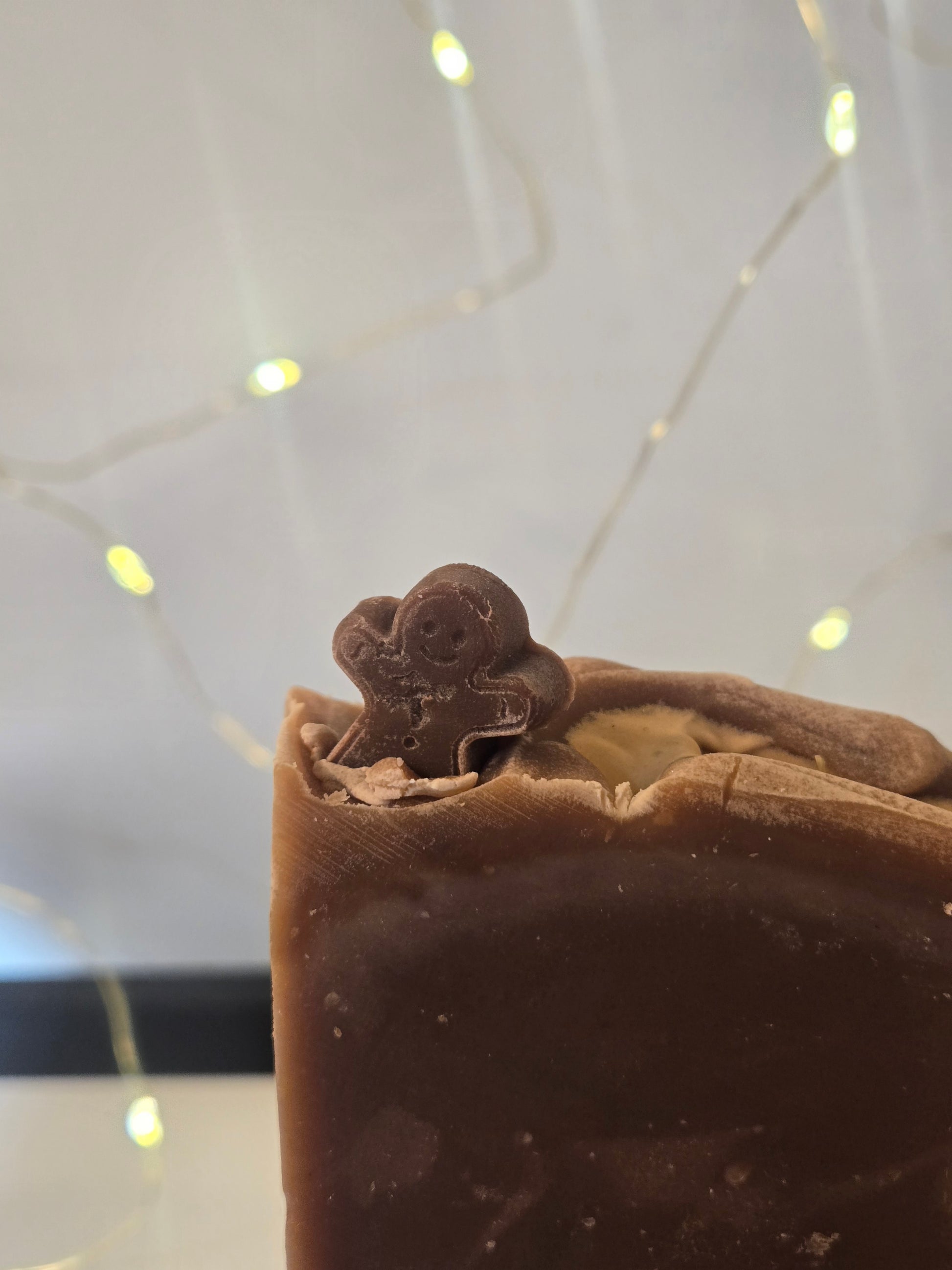 Our Gingerbread Soap, topped with an adorable gingerbread man for a sweet, whimsical touch. This delightful bar is scented with warm notes of spiced gingerbread—think ginger, cinnamon, and a hint of vanilla—creating a cozy aroma that feels just like freshly baked treats.